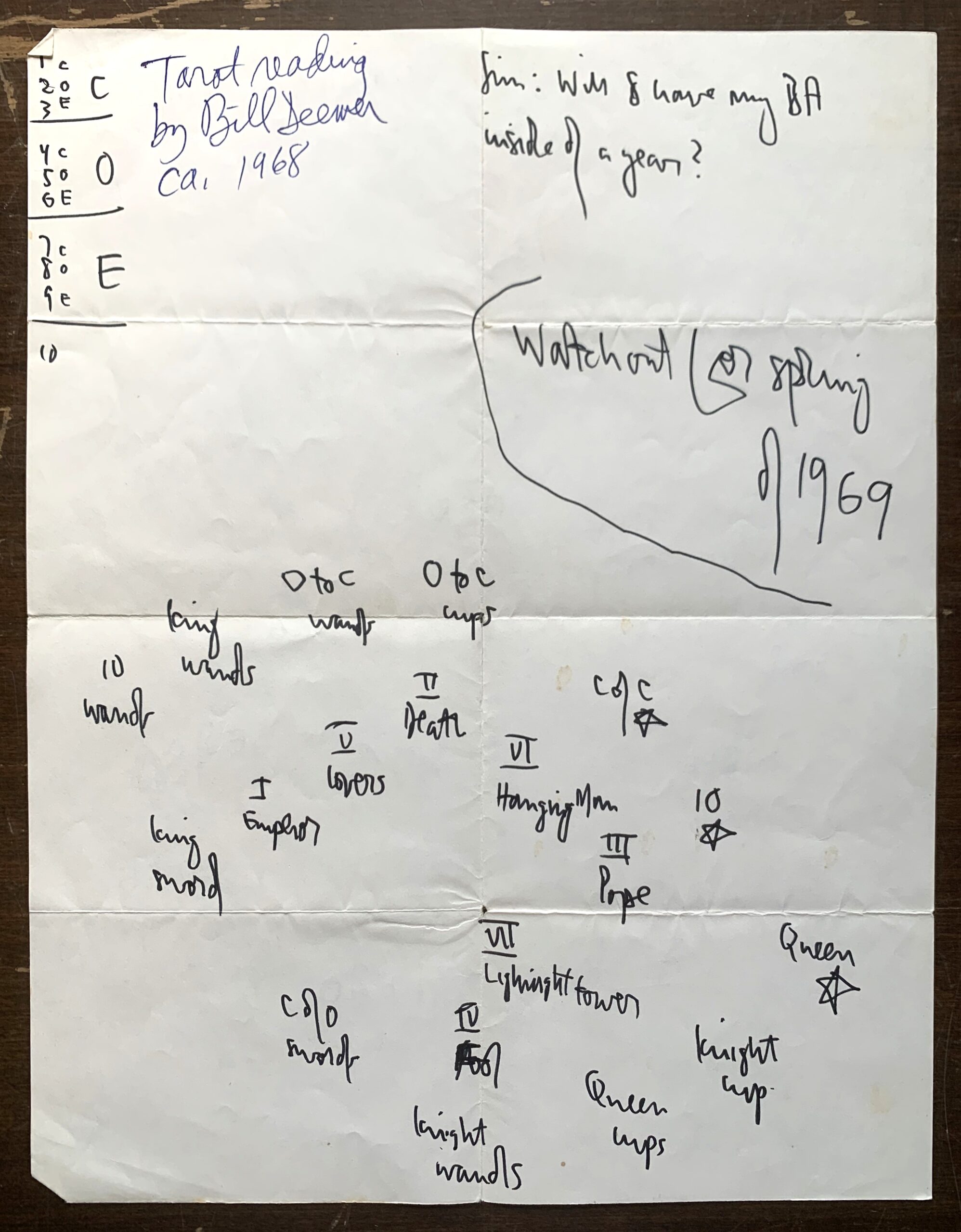 This image shows notes from a tarot card reading from circa 1968 with notes “Will I have my BA inside of a year?” and “Watchout for spring of 1969”.