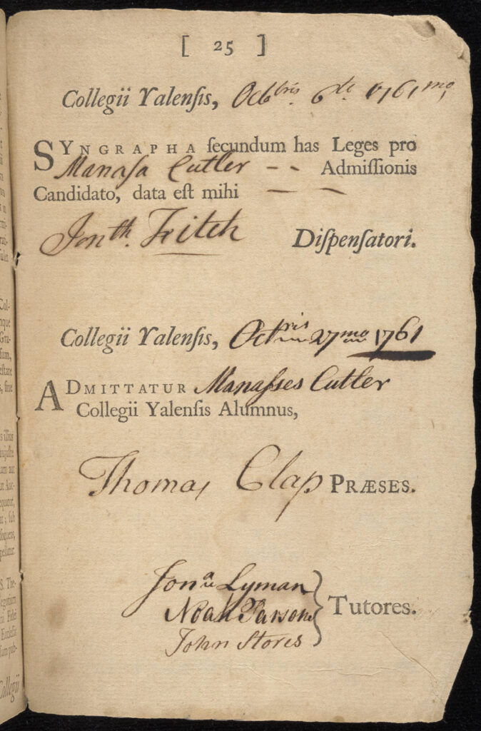 Manasseh Cutler Yale College admittance notice, 1761.