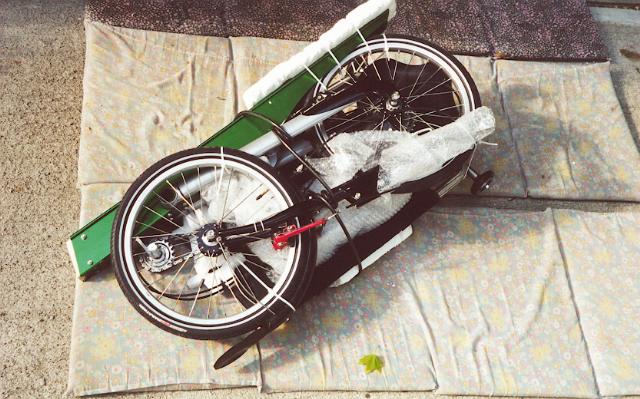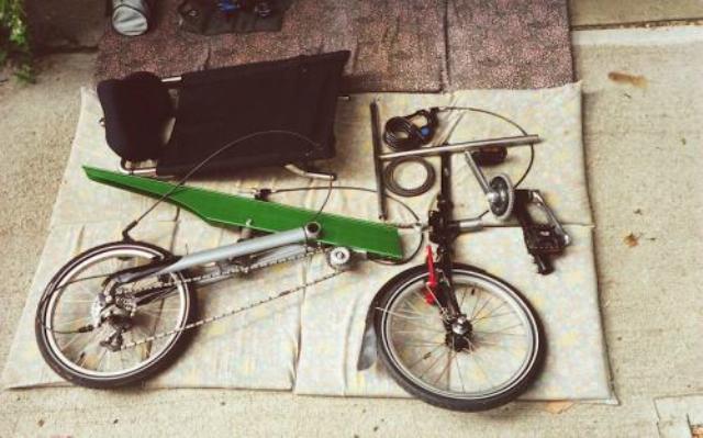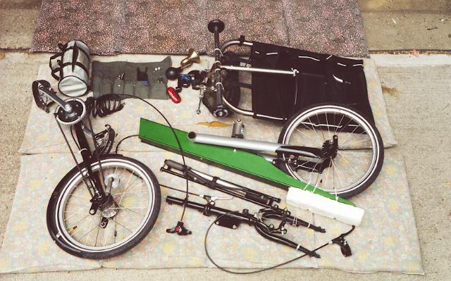 The following picture shows the Grasshopper 5F disassembled and laid out ready for packing. Notice the handlebar with the two rollerblade wheels attached cable-tied to the bottom of the seat. This is placed at the bottom of the duffel bag with the wheels sticking out.