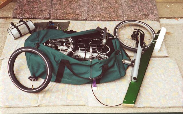 The following picture shows the bike partially packed in the duffel bag. Everything is tied tightly together with cable ties and an attempt is made to protect vital exposed parts - notice for example wooden block bolted into the sawn-off section of the BikeE aluminum frame, and the polystyrene foam tied to the opposite end of the frame. In spite of our best efforts to pack the bikes "airline proof" we find that there is always evidence of rough handling - scratches, dents, tears. We do not have a satisfactory answer to this problem.