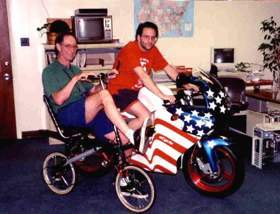 Toothed belt drives for power transmission is not a new concept. They are currently used on some of the newer Harley Davidson motorcycles. I was introduced to belt drives by Dan Sodomsky of eCycle, who first developed them for bicycles, and later adapted them for use on the fully electric and hybrid (diesel) electric sport motorcycles that he is developing at eCycle. The following photograph shows myself on the Grasshopper 5 and Dan on his prototype electric motorcycle. Another photograph shows the belt drives of both the Grasshopper 5 and the eCycle electric motorcycle for comparison. Both belts are Gates Polychain belts with an 8 mm pitch.