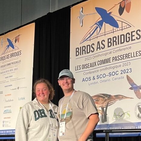 Students Jacob Morgan (MS) and Gabi Lindsey (HTC undergraduate) presented work from the lab in London, Ontario, Canada, at the 2023 American Ornithological Society and Society of Canadian Ornithologists meeting. Jacob presented a poster titled “An Analysis of Overwinter Habitat Patch Use and Movement Ecology of Slate-colored Juncos, Junco hyemalis“. Gabi presented a poster titled “Migration and Stopover Habitat Use of Swainson’s Thrushes in Southeastern Ohio”.